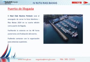 El Real Club Náutico Portosín será el encargado de cerrar la Ruta Marítima Rías Baixas 2024 en su cuarta edición como puerto de llegada. Facilitando la estancia en las 48 horas posteriores a la finalización del evento. Pudiendo contactar con la organización para estancias superiores.